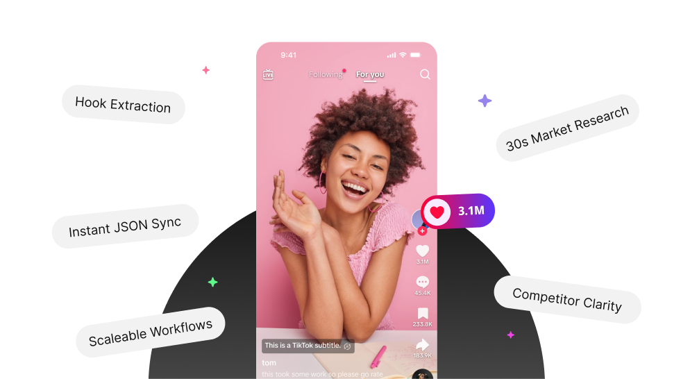 Ask your AI to pull transcripts, generate hooks, analyze virality, and research creators from any TikTok, Instagram Reel, or YouTube Short. Directly in conversation.